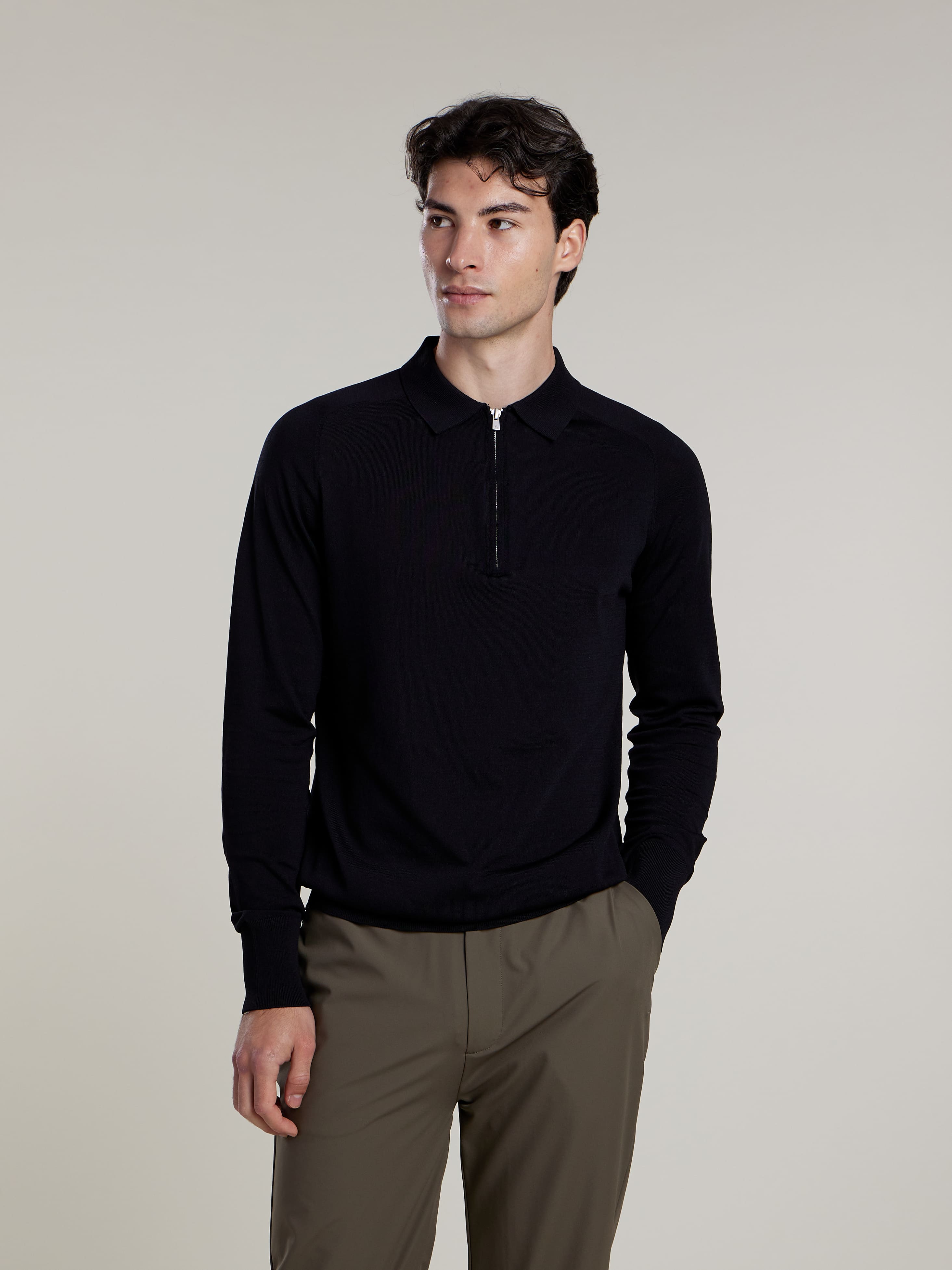 The BENNO long-sleeve polo combines a sleek flatknit design with a modern zip-up collar. Its slim fit ensures a comfortable and tailored feel, making it a flexible addition to your wardrobe.